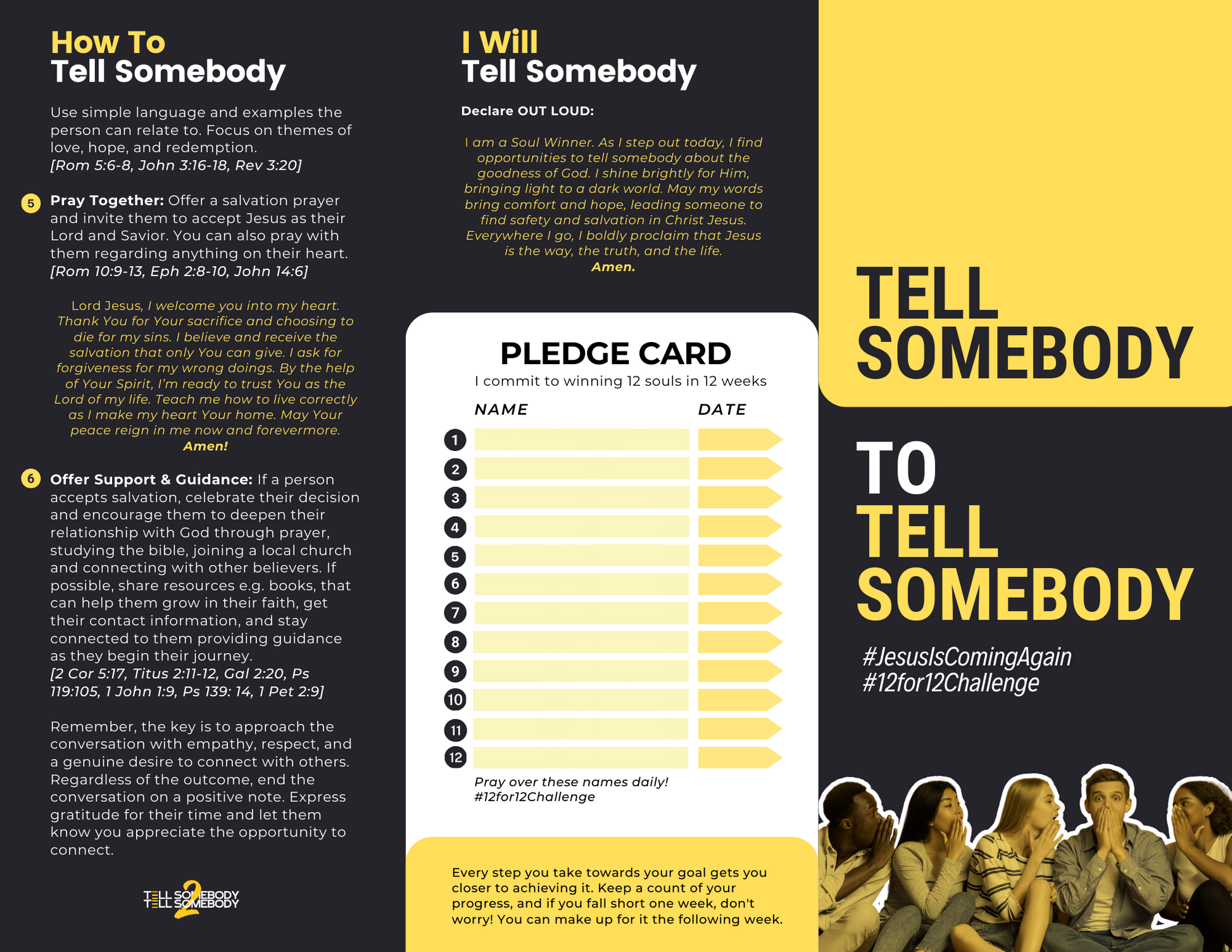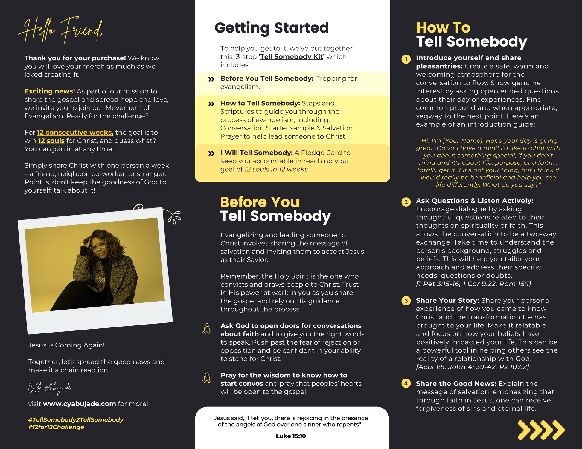 Guess what? Your order comes with a “Tell Somebody Kit”—a powerful tri-fold guide filled with scriptures, a salvation prayer, and a pledge card to help you confidently share your faith and lead others to Christ.
